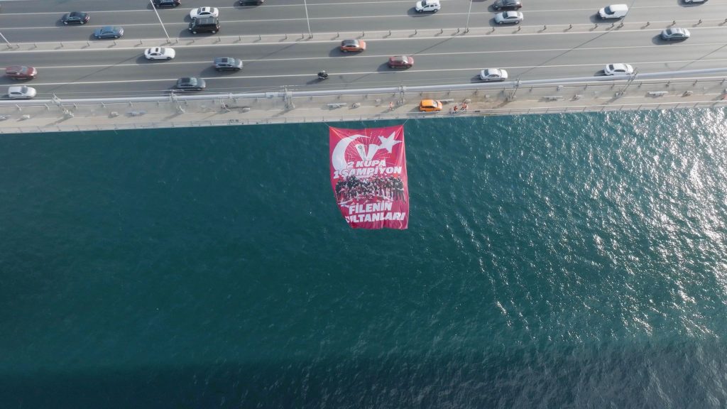 Filenin Sultanları’nın ‘2 Kupa 1 Şampiyon’ yazılı bayrağı, 15 Temmuz Şehitler Köprüsü, Fatih Sultan Mehmet Köprüsü ve Yavuz Sultan Selim Köprüsü’nde dalgalanıyor.