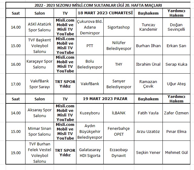 Misli.com Sultanlar Ligi 2022-2023 Sezonu 20. Hafta maçları ile AXA Sigorta Efeler Ligi Metin Görgün Sezonu 21. Hafta karşılaşmaları 18-19 Mart 2023 tarihlerinde oynanacak.