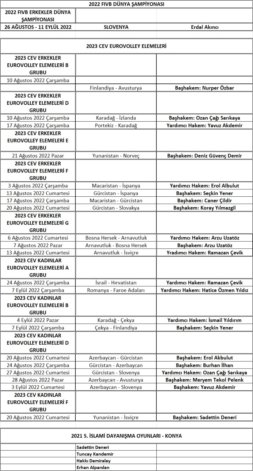Uluslararası Voleybol Hakemimiz Erdal Akıncı 2022 FIVB Dünya Şampiyonası’nda, Nurper Özbar, Ozan Çağı Sarıkaya, Yavuz Akdemir, Deniz Güvenç Demir, Erol Akbulut, Seçkin Yener, Caner Çildir, Koray Yılmazgil, Arzu Uzatöz, Ramazan Çevik, Hatice Özmen Yıldız, İsmail Yıldırım, Meryem Tekol Pelenk, Burhan İlhan, Sadettin Deneri 2023 CEV Eurovolley Elemeleri’nde ve Sadettin Deneri, Tuncay Kandemir ile Ulusal Voleybol Hakemlerimiz Hakkı Demiralay ve Erhan Alparslan Konya’da gerçekleştirilecek olan 5. İslami Dayanışma Oyunları’nda ülkemizi temsil edecekler.