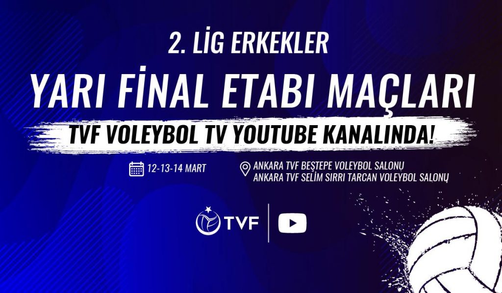Türkiye Voleybol Federasyonu tarafından organize edilen 2. Lig Erkekler Yarı Final Etabı’nın tüm heyecanı, TVF Voleybol TV’nin YouTube kanalından voleybol severler ile buluşacak.