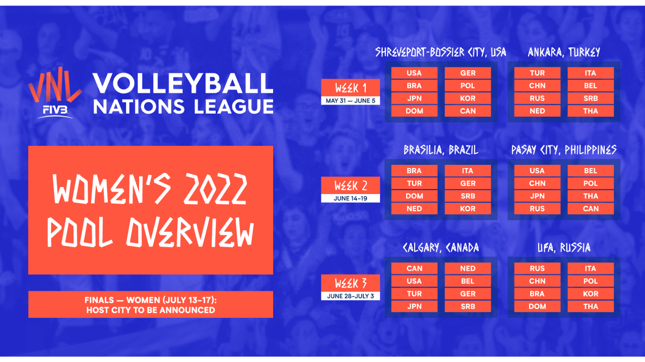 FIVB’ten yapılan açıklamaya göre A Milli Kadın Voleybol Takımımız, ilk hafta Ankara’da organizasyonun ev sahipliğini üstlenecek. 31 Mayıs-5 Haziran 2022 tarihleri arasında oynanacak ilk hafta müsabakalarında Çin, İtalya, Rusya, Hollanda, Belçika, Sırbistan ve Tayland takımları yer alacak.