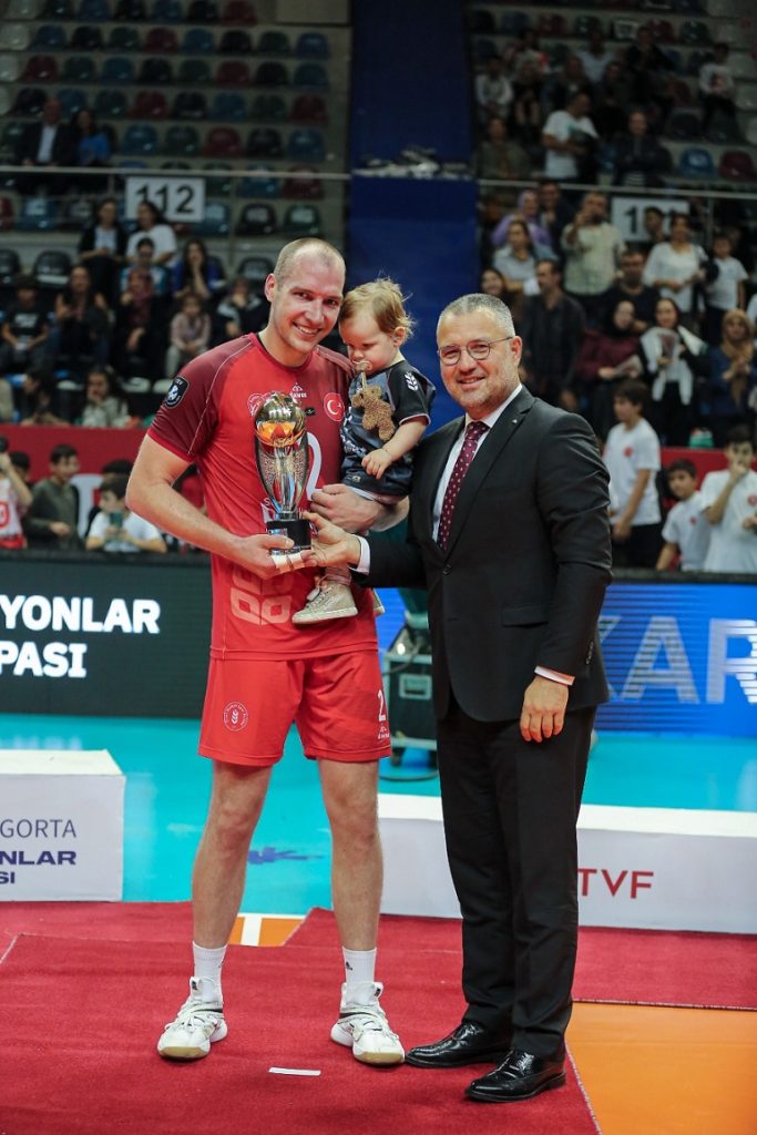Final karşılaşmasının ‘En Değerli Oyuncusu’ (MVP) seçilen Ziraat Bankkart takımından Wouter Ter Maat’a (Hollanda/Pasör Çaprazı) ödülünü AXA Sigorta CEO’su Yavuz Ölken takdim etti.
