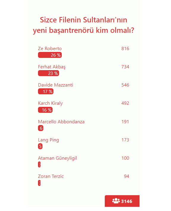 29 Kasım tarihinde “Sizce Filenin Sultanları’nın yeni başantrenörü kim olmalı?” başlığıyla açılan anketimiz, Brezilyalı çalıştırıcı Ze Roberto’nun birinciliğiyle sonuçlandı.