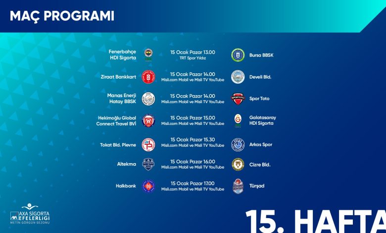| 15 Ocak Pazar | 15.00 | Hekimoğlu GCT BVİ – Galatasaray HDI Sigorta | Misli.com Mobil ve Misli TV YouTube | TVF Cengiz Göllü |