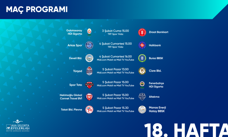 AXA Sigorta Efeler Ligi Metin Görgün Sezonu’nda 18. hafta, yarın Galatasaray HDI Sigorta – Ziraat Bankkart maçıyla başlayacak. Karşılaşma, saat 15.00’te TRT Spor Yıldız’da canlı yayınlanacak.
