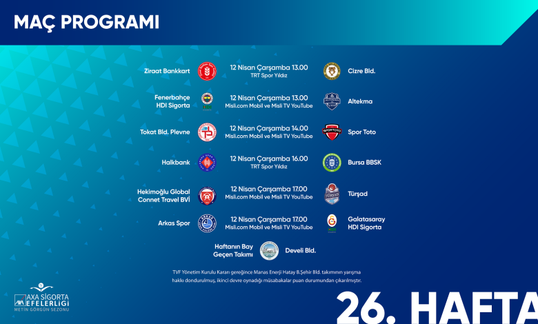| 12 Nisan Çarşamba | 17.00 | Arkas Spor-Galatasaray HDI Sigorta | Misli.com Mobil ve Misli TV YouTube | TVF Atatürk |