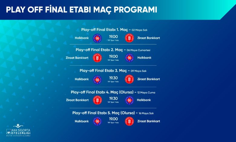 | 16 Mayıs Salı | 5.Maç (Olursa) | 19.00 | Halkbank-Ziraat Bankkart | TRT Spor Yıldız | TVF Başkent |
