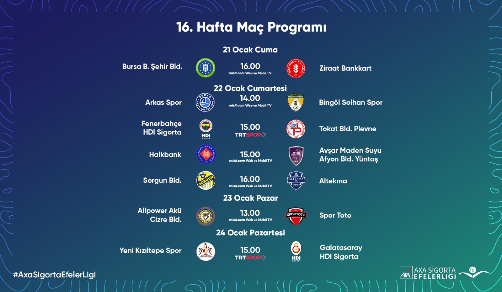 AXA Sigorta Efeler Ligi’nde 16. hafta, yarın (21 Ocak Cuma) oynanacak Bursa B.Şehir Bld. – Ziraat Bankkart karşılaşmasıyla başlayacak.