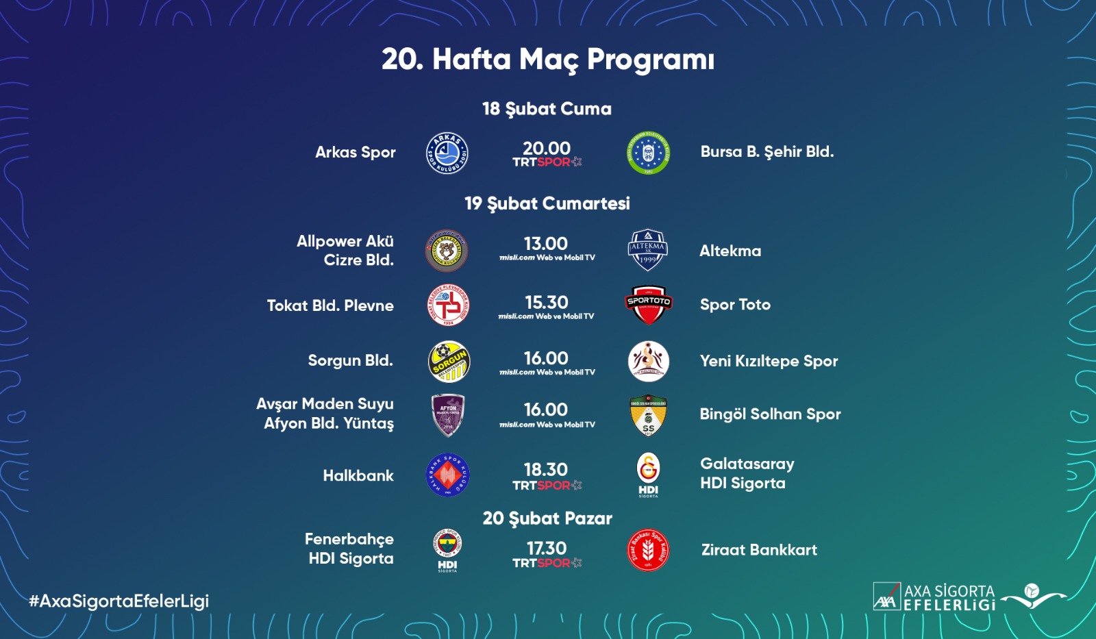 | 18 Şubat Cuma | 20.00 | Arkas Spor-Bursa B.Şehir Bld. | TRT Spor Yıldız | Atatürk-Sigorta Shop |