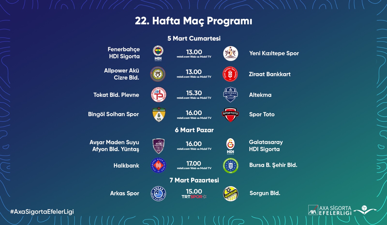 | 5 Mart Cumartesi | 13.00 | Fenerbahçe HDI Sigorta – Yeni Kızıltepe Spor | Misli.Com Web ve Mobil TV | Burhan Felek Vestel |