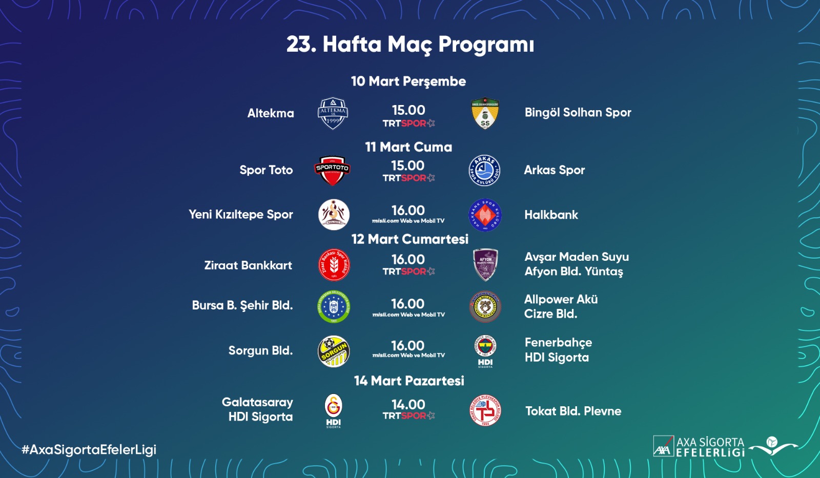AXA Sigorta Efeler Ligi’nde 23. hafta, yarın oynanacak Altekma – Bingöl Solhan Spor karşılaşmasıyla başlayacak.