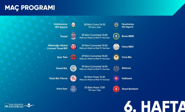 AXA Sigorta Efeler Ligi’nde 6. hafta, yarın Galatasaray HDI Sigorta-Fenerbahçe HDI Sigorta karşılaşmasıyla başlayacak.
