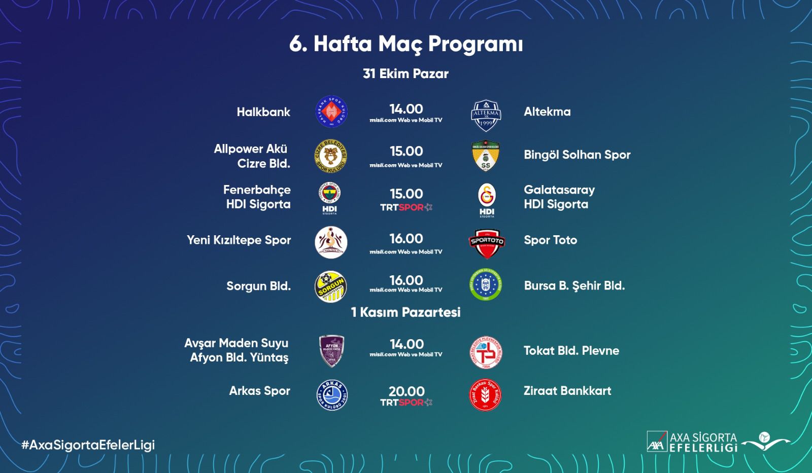 AXA Sigorta Efeler Ligi’nde 6. hafta, yarın (31 Ekim Pazar) oynanacak karşılaşmalarla başlayacak.