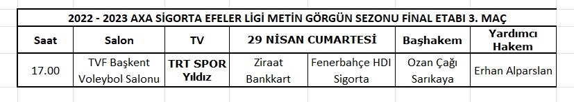 AXA Sigorta Efeler Ligi Metin Görgün Sezonu Play Off etabı 3. maçı 29 Nisan 2023 tarihinde oynanacak.