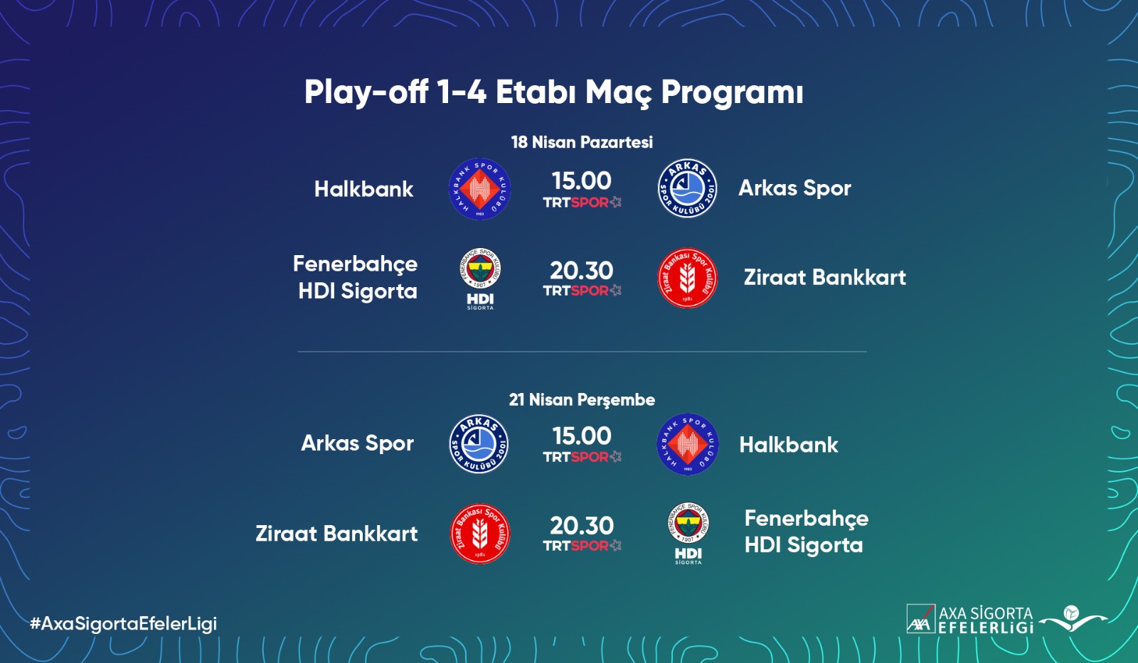 21 Nisan Perşembe 2.Maç (Alt) 15.00 (4-1) Arkas Spor – Halkbank TRT Spor Yıldız Atatürk Sigorta Shop