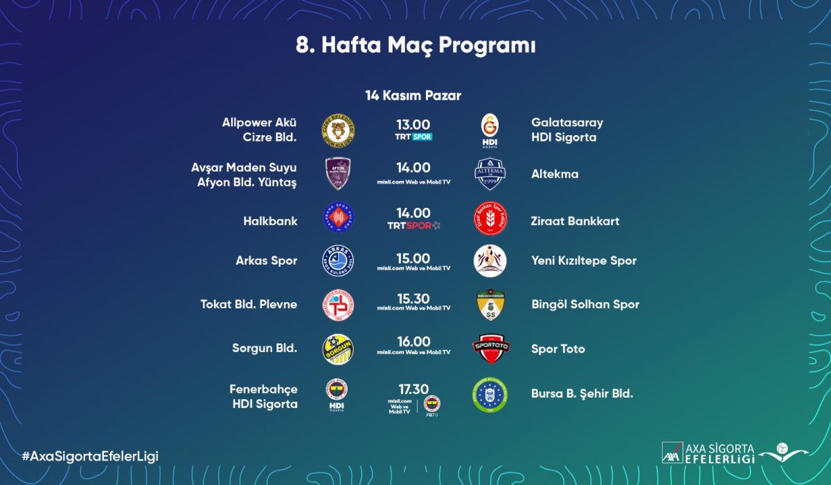 AXA Sigorta Efeler Ligi’nde 8. hafta, yarın (14 Kasım Pazar) oynanacak karşılaşmalarla başlayacak.