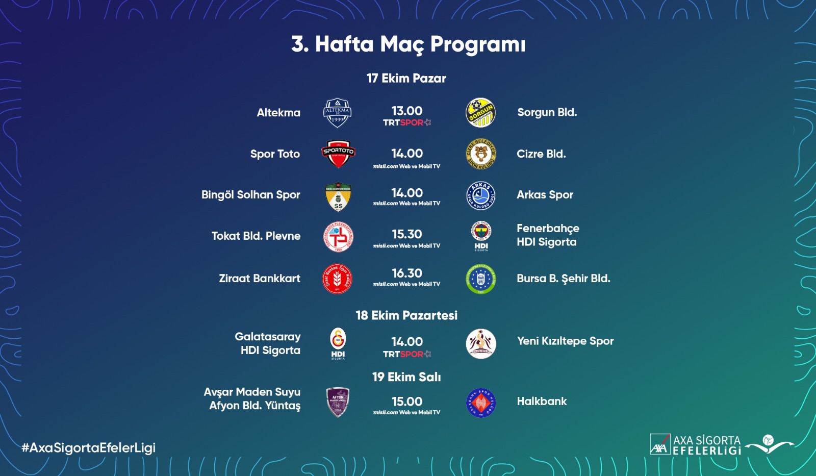 AXA Sigorta Efeler Ligi’nde 3. hafta, yarın (17 Ekim Pazar) oynanacak karşılaşmalarla başlayacak.