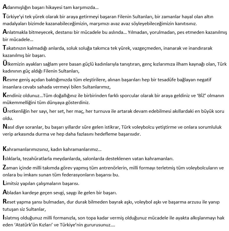 Sitemizin köşe yazarı, eski milli voleybolcu ve yorumcu Burcu Hakyemez Dal, Cumhuriyetimizin 100. yılında Avrupa şampiyon olan Filenin Sultanları için “Atatürk’ün Kızları” başlıklı köşe yazısı yazdı.