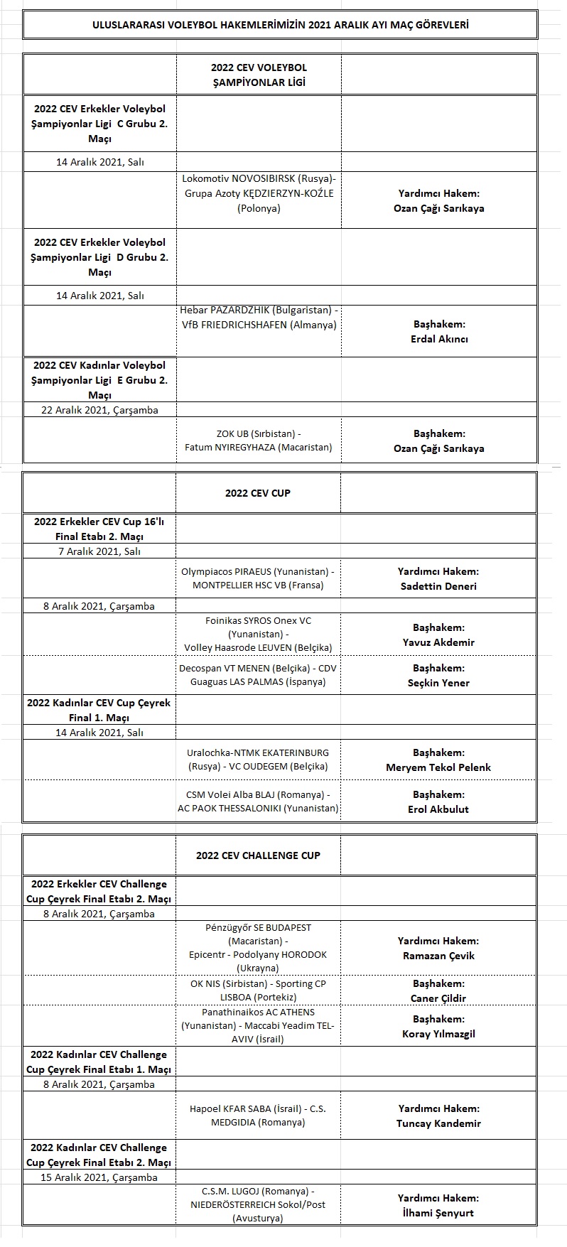 Avrupa Voleybol Konfederasyonu (CEV), Uluslararası Voleybol Hakemlerimiz, Erdal Akıncı, Ozan Çağı Sarıkaya (2), Sadettin Deneri, Seçkin Yener, Meryem Tekol Pelenk, Erol Akbulut, Ramazan Çevik, Caner Çildir, Koray Yılmazgil, Tuncay Kandemir, İlhami Şenyurt’u Aralık ayı içinde oynanacak 2022 CEV Şampiyonlar Ligi, CEV Cup ve CEV Challenge Cup maçlarında görevlendirdi.
