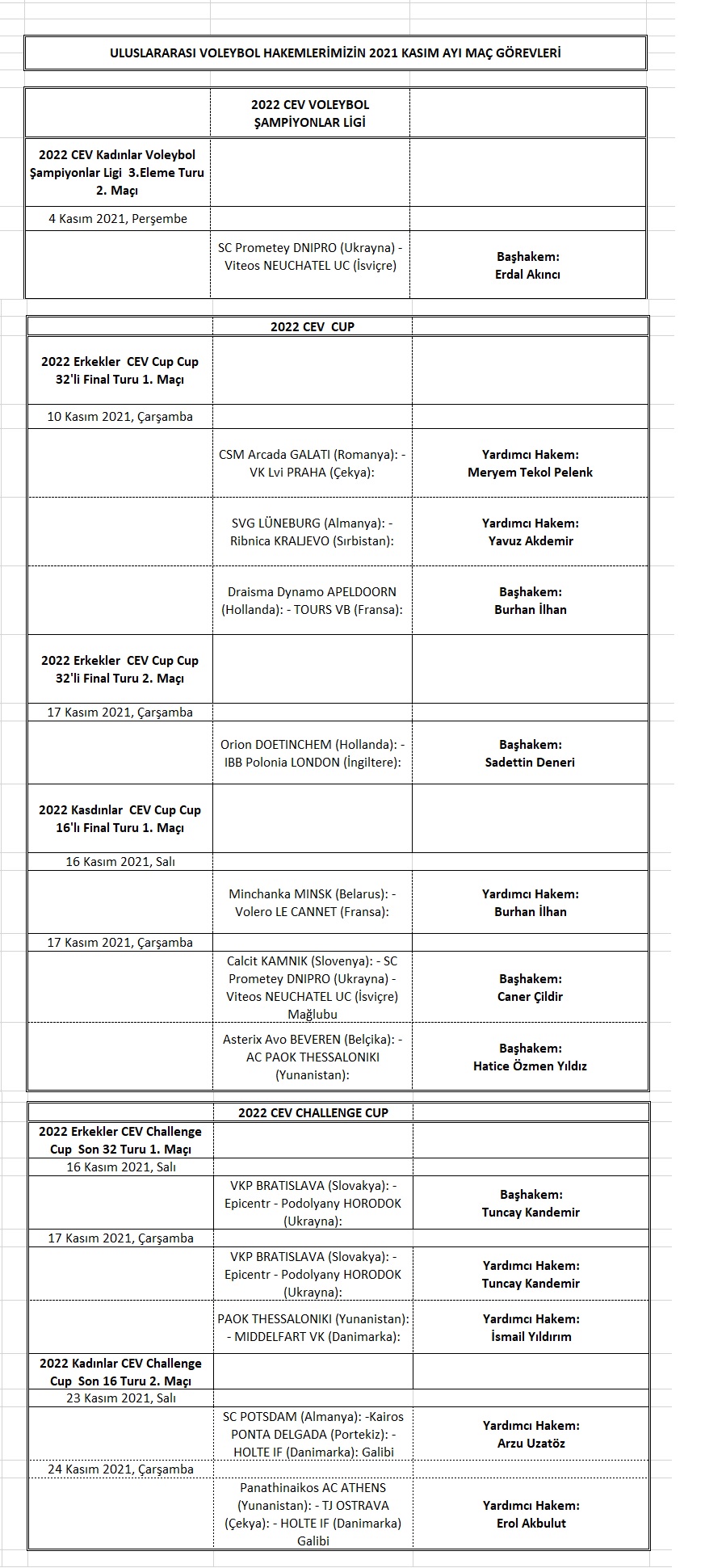 Avrupa Voleybol Konfederasyonu (CEV), Uluslararası Voleybol Hakemlerimiz,  Erdal Akıncı, Meryem Tekol Pelenk, Yavuz Akdemir, Burhan İlhan (2), Sadettin Deneri, Caner Çildir, Hatice Özmen Yıldız,  Tuncay Kandemir (2), İsmail Yıldırım, Arzu Uzatöz, Erol Akbulut’u Kasım ayı içinde oynanacak 2022 CEV Şampiyonlar Ligi, CEV Cup ve CEV Challenge Cup maçlarında görevlendirdi.