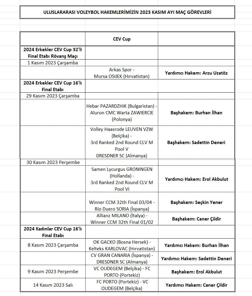 Avrupa Voleybol Konfederasyonu (CEV), 2023 Avrupa Kupalarında 12 Uluslararası Voleybol Hakemimize Kasım ayında CEV Cup ve CEV Challenge Cup’ta oynanacak 16 karşılaşmada maçlarda görev verdi.