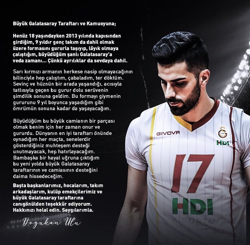 Milli orta oyuncu Doğukan Ulu, 9 sezondur formasını giydiği Galatasaray HDI Sigorta’ya veda etti.