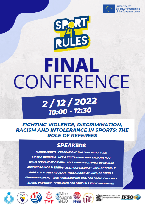 Erasmus+ Programı – Spor iş birliği ortaklıkları kapsamında EACEA (Eğitim Görsel İşitsel ve Kültür İcra Ajansı) tarafından desteklenen merkezi “Sport4Rules” projesi kapsamında; İtalya Voleybol Federasyonu tarafından koordine edilen ve Türkiye Voleybol Federasyonu, Bulgaristan Gençlik ve Spor Bakanlığı, Uluslararası Spor Yetkilileri Federasyonu, Fransız Basketbol Federasyonu, Sevilla Üniversitesi, Hırvatistan Voleybol Federasyonu, Bosna- Hersek Olimpiyat Komitesi ve Mine Vaganti adlı STK kuruluşunun dahil olduğu heterojen çalışma grubu; okullar, sporcular, antrenörler, ebeveynler ve halk için eğitim modelleri oluşturulması ve yaygınlaştırma materyalleri geliştirilmesi yoluyla; sporda şiddetle mücadele yönünde hakem rolünün önemini ortaya çıkarmayı hedeflemektedir.