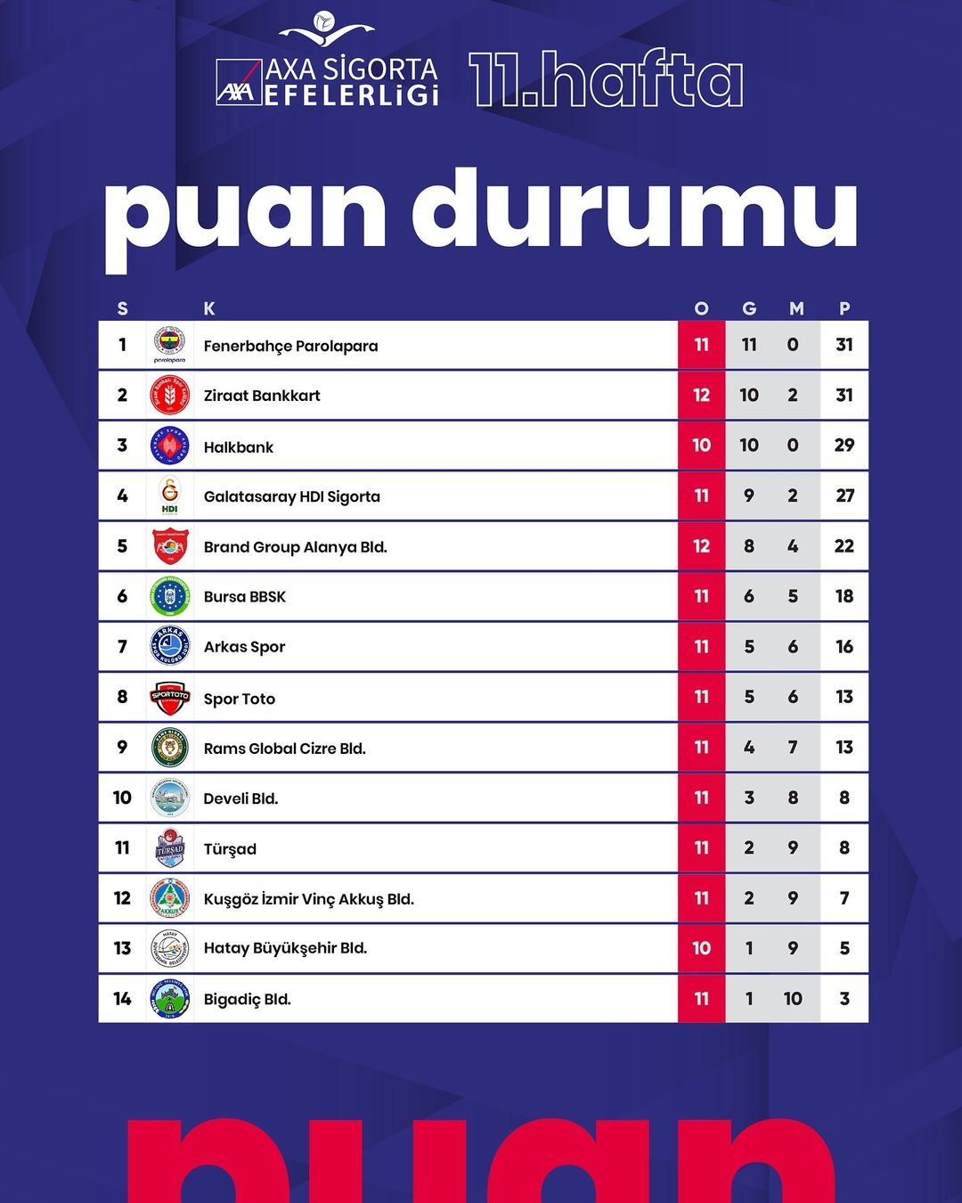 AXA Sigorta Efeler Ligi’nde Fenerbahçe Parolapara, Vodafone Sultanlar Ligi’nde ise Fenerbahçe Opet, puan durumunda haftayı lider konumda kapadılar.