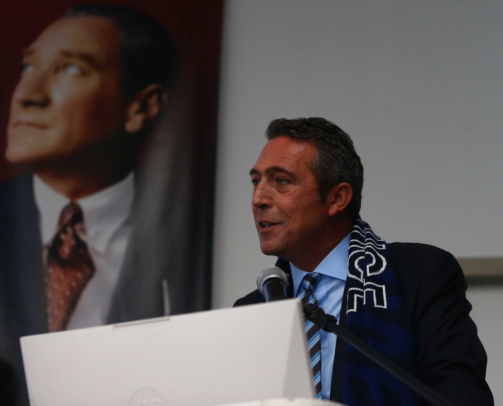 Öğrenciler, Ali Koç’u girişte meşalelerle karşılarken, Eda Erdem Dündar’a da çiçek verdiler.