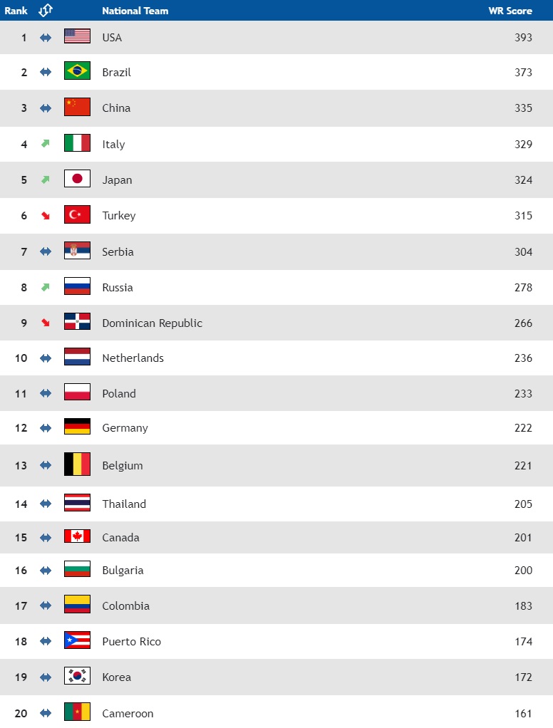 16 Temmuz 2021 tarihi itibarıyla FIVB Dünya Sıralamasında 4. sıraya yer alan Filenin Sultanları, FIVB Dünya Sıralaması güncel durumunda 6. sırada yer alıyor.