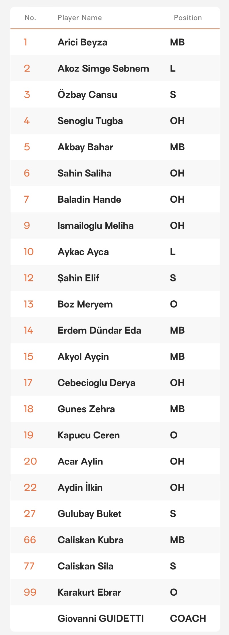FIVB’nin internet sitesinde yayınlanan Filenin Sultanları’nın geniş kadrosu şöyle:
