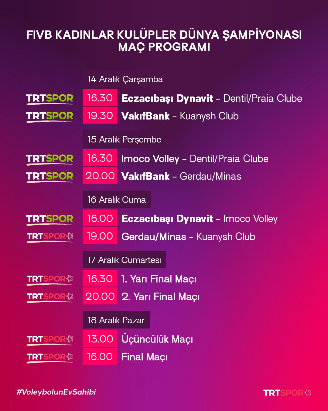 Türkiye’nin ev sahipliğinde 14-18 Aralık 2022 tarihlerinde Antalya Spor Salonu’nda düzenlenecek FIVB Kadınlar Kulüpler Dünya Şampiyonası maç programı şöyle: