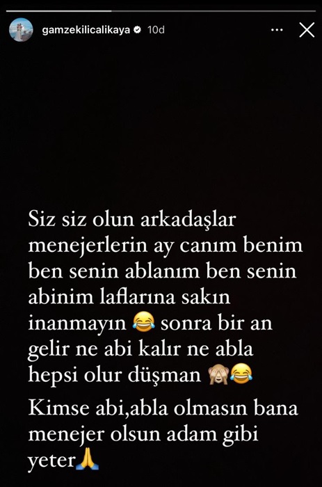 Gamze Kılıç’ın menajer ismi vermeden yaptığı paylaşımda, kendisinin menajeri ile yaşadığı bir olumsuzluk neticesinde bu paylaşımı yaptığı tahmin ediliyor.