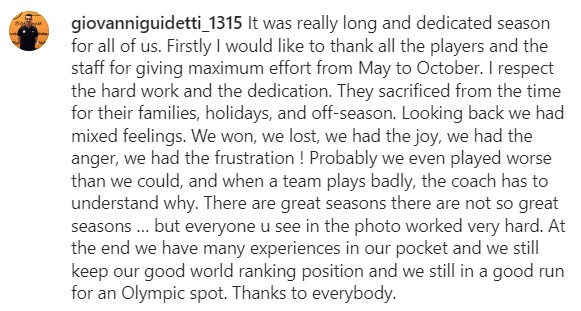 “Hepimiz için gerçekten uzun ve özel bir sezondu. Öncelikle, Mayıs-Ekim ayları arasında azami çabayı gösterdikleri için tüm oyunculara ve personele teşekkür etmek istiyorum. Emek ve özveriye saygı duyuyorum. Zamandan aileleri, tatiller ve sezon dışı için feda ettiler. Geriye dönüp baktığımızda karışık duygular içindeydik. Kazandık, kaybettik, sevincimiz oldu, öfkemiz oldu, hüsran yaşadık! Muhtemelen elimizden gelenden daha kötü oynadık ve bir takım kötü oynadığında koç nedenini anlamalı. Harika mevsimler var, o kadar harika mevsimler yok… ama fotoğrafta gördüğünüz herkes çok çalıştı. Sonunda cebimizde pek çok deneyim var ve hala dünya sıralamasındaki iyi konumumuzu koruyoruz ve hala Olimpiyat noktası için iyi bir koşu içindeyiz. Herkese teşekkürler.”