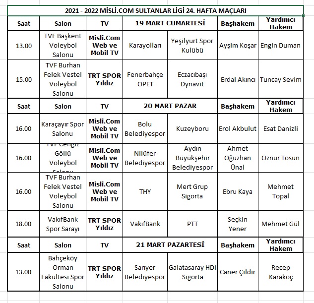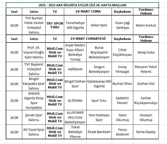 AXA Sigorta Efeler Ligi ile Misli.com Sultanlar Ligi’nde 2021-2022 Sezonu 24. hafta maçları 18 – 21 Mart 2022 tarihlerinde oynanacak.