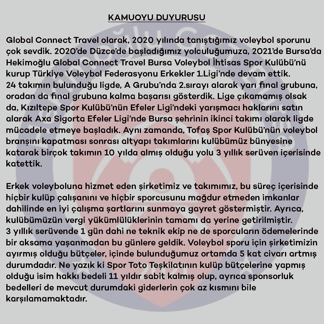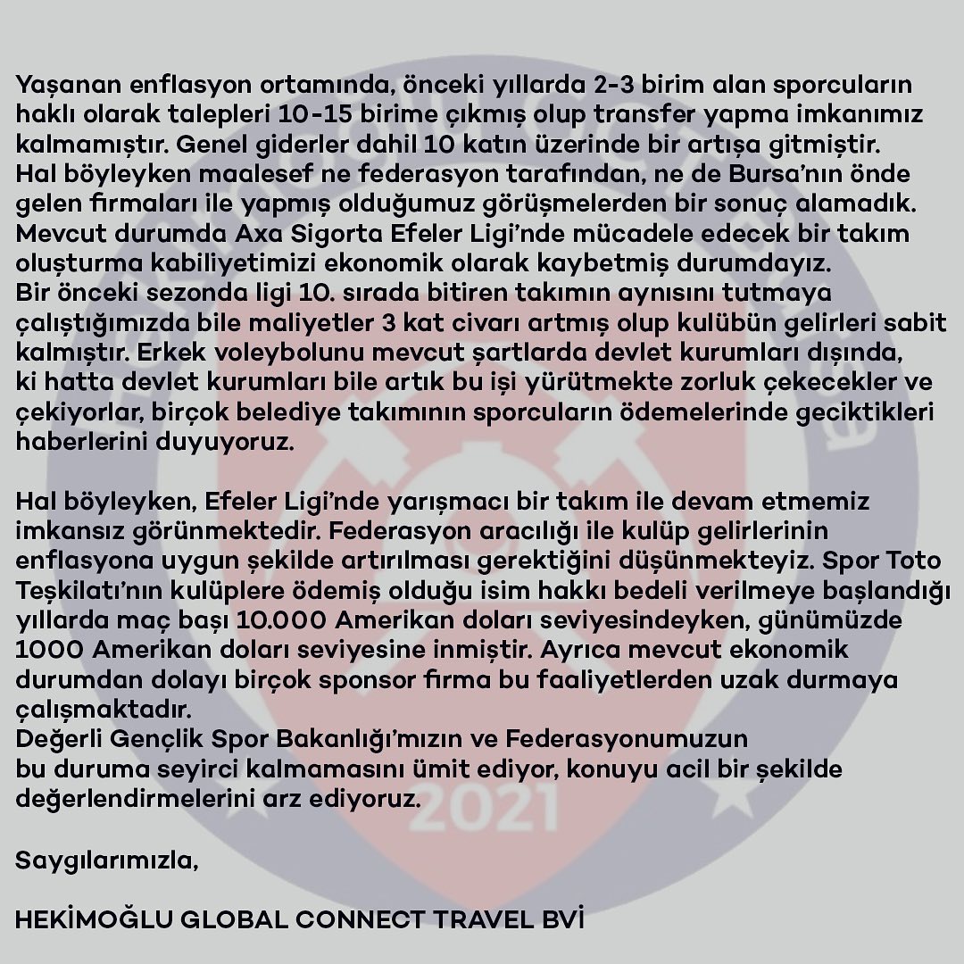 AXA Sigorta Efeler Ligi takımlarından Hekimoğlu Global Connect Travel BVİ kamuoyu açıklaması yaptı. Açıklama şöyle: