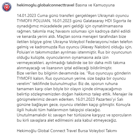 Hekimoğlu Global Connect Travel BVİ’den yeni transferi Ukraynalı smaçör Tymofili Poluian ile ilgili açıklama