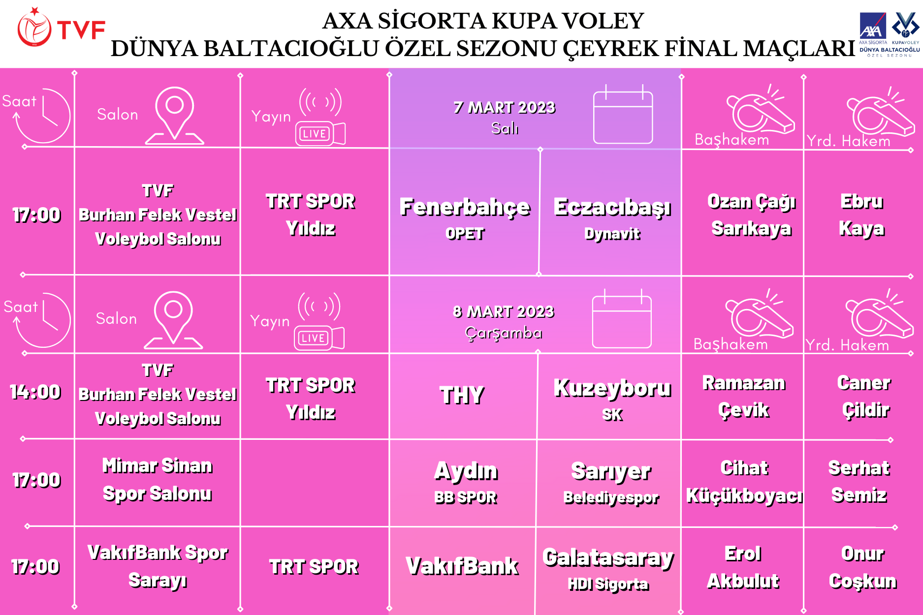 Kadınlar AXA Sigorta Kupa Voley Dünya Dünya Baltacıoğlu Özel Sezonu Çeyrek Final maçları 7-8 Mart 2023 tarihlerinde oynanacak. Karşılaşmalarda görev yapacak hakem bilgileri şöyle: