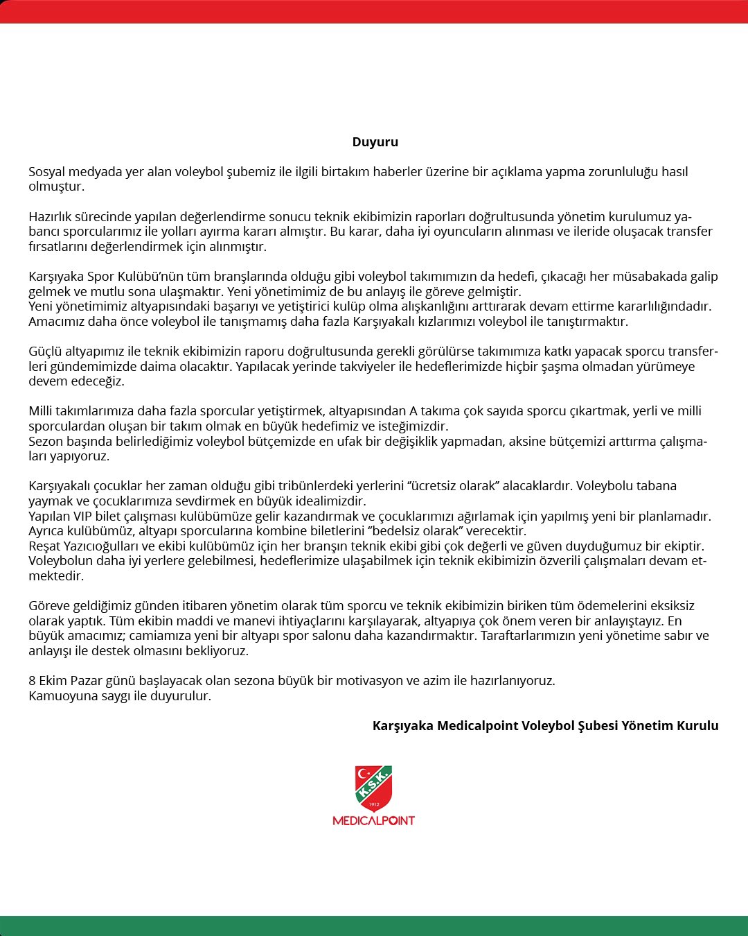 KFC Kadınlar 1. Ligi takımlarından Karşıyaka Medicalpoint’in sosyal medya hesabından yapılan paylaşımda yabancı oyuncularla yolları ayırma kararı alındığı açıklandı.