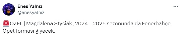 TRT Spor ve TRT Spor Yıldız muhabiri Enes Yalnız, sosyal medya hesabından yaptığı paylaşımda Fenerbahçe Opet’in Polonyalı voleybolcusu Magdalena Stysiak’ın 2024-2025 sezonunda da Fenerbahçe Opet forması giyeceğini yazdı.