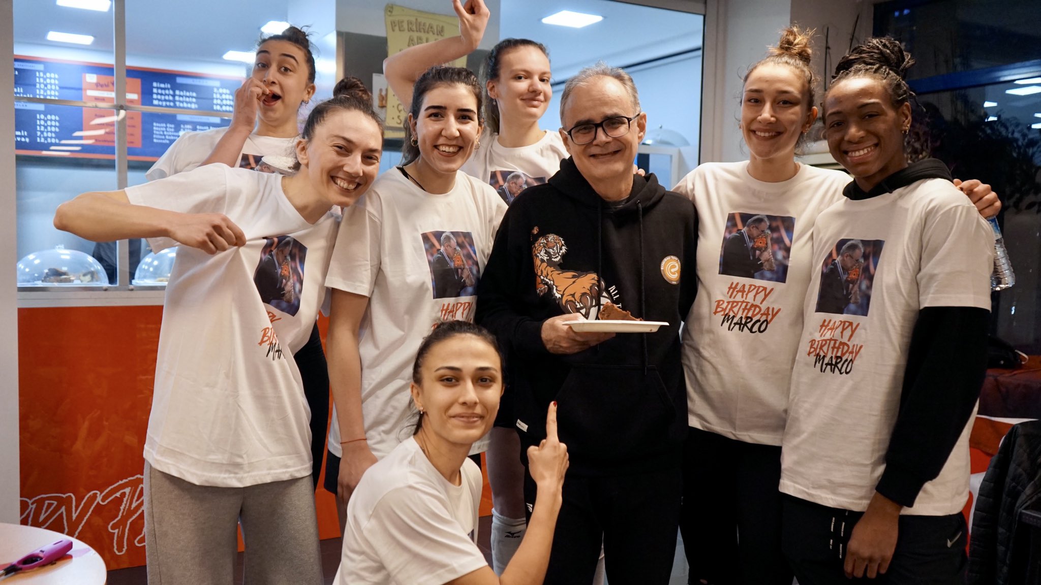 Sporcular ve teknik ekip, “Happy Birthday Morco” yazılı tişört giyerek Marco Aurelio Motta’ya sürpriz yaptılar.
