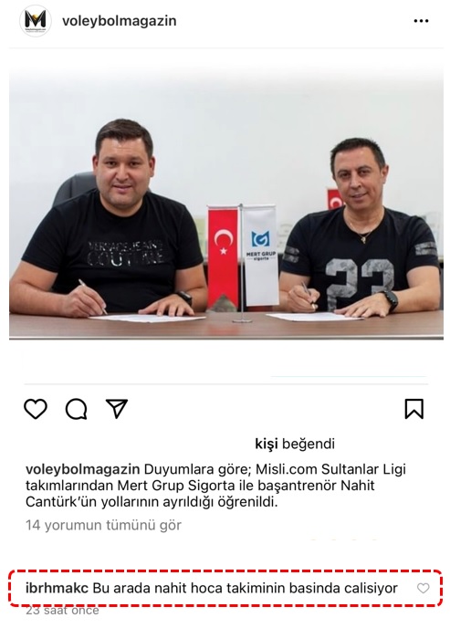 Duyumlara göre başantrenör Nahit Cantürk ile yollarının ayrıldığı öğrenilen Mert Grup Sigorta yeni antrenör arayışlarına başladı ve dün bu konuda çeşitli görüşmeler yaptı. Ancak Mert Grup Sigorta’nın Genel Menajeri İbrahim Akcan’ın dün sosyal medyada “Bu arada nahit hoca takiminin basinda calisiyor” yorumu kafaları karıştırdı.