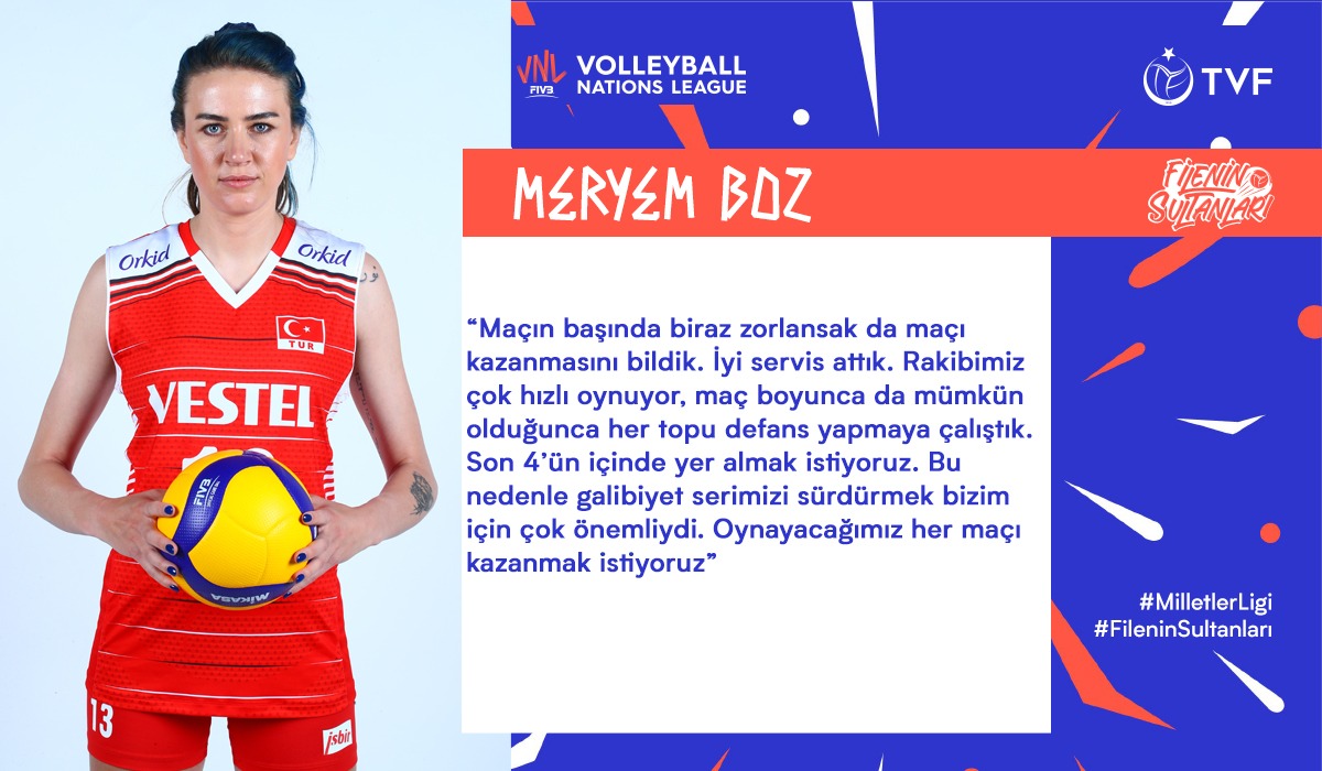 Milletler Ligi’nde Tayland’ı 3-1 mağlup eden A Milli Kadın Voleybol Takımımızda pasör çaprazlarından Meryem Boz, karşılaşmanın ardından galibiyeti değerlendirdi.