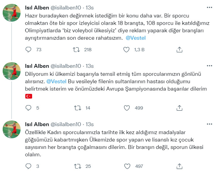 Milli Basketbolcu Işıl Alben, sosyal medya hesabından, Vestel’in Filenin Sultanları için hazırladığı Biz Voleybol Ülkesiyiz reklamına tepki gösterdi.