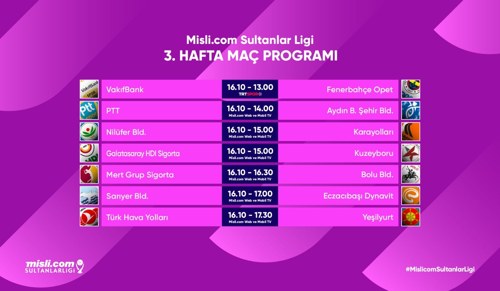 Misli.com Sultanlar Ligi’nde 3. hafta, yarın (16 Ekim Cumartesi) oynanacak karşılaşmalarla başlayacak.