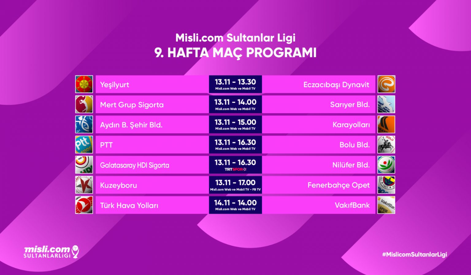 Misli.com Sultanlar Ligi’nde 9. hafta, yarın (13 Kasım Cumartesi) oynanacak karşılaşmalarla başlayacak.