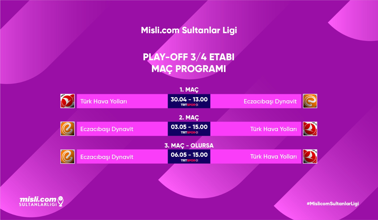 | 30 Nisan Cumartesi | 1.Maç (Alt) | 13.00 | Türk Hava Yolları-Eczacıbaşı Dynavit | TRT Spor Yıldız | Burhan Felek Vestel |