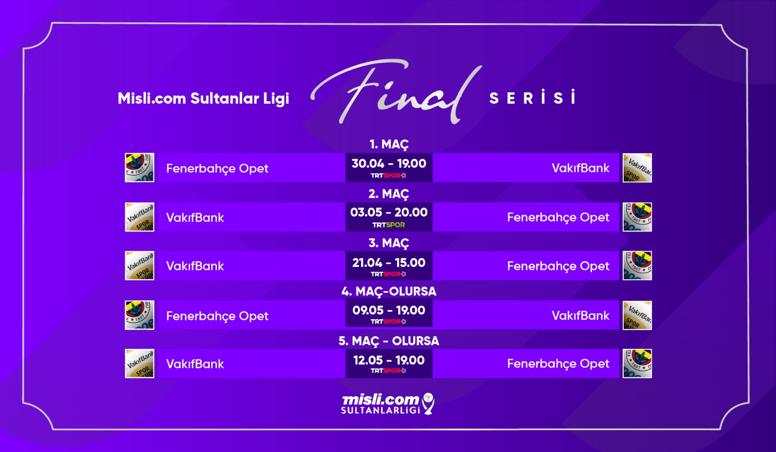 9 Mayıs Pazartesi 4.Maç (Alt-Olursa) 19.00 Fenerbahçe Opet-VakıfBank TRT Spor Yıldız Burhan Felek Vestel