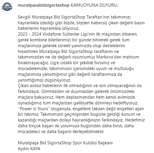 Muratpaşa Belediyesi Sigorta Shop Spor Kulübü Başkanı Aydın Kaya, ligdeki performansıyla dikkat çeken Rus smaçör Marina Markova ile ilgili çıkan transfer iddialarını yalanladı ve konuyla ilgili açıklama yaptı.