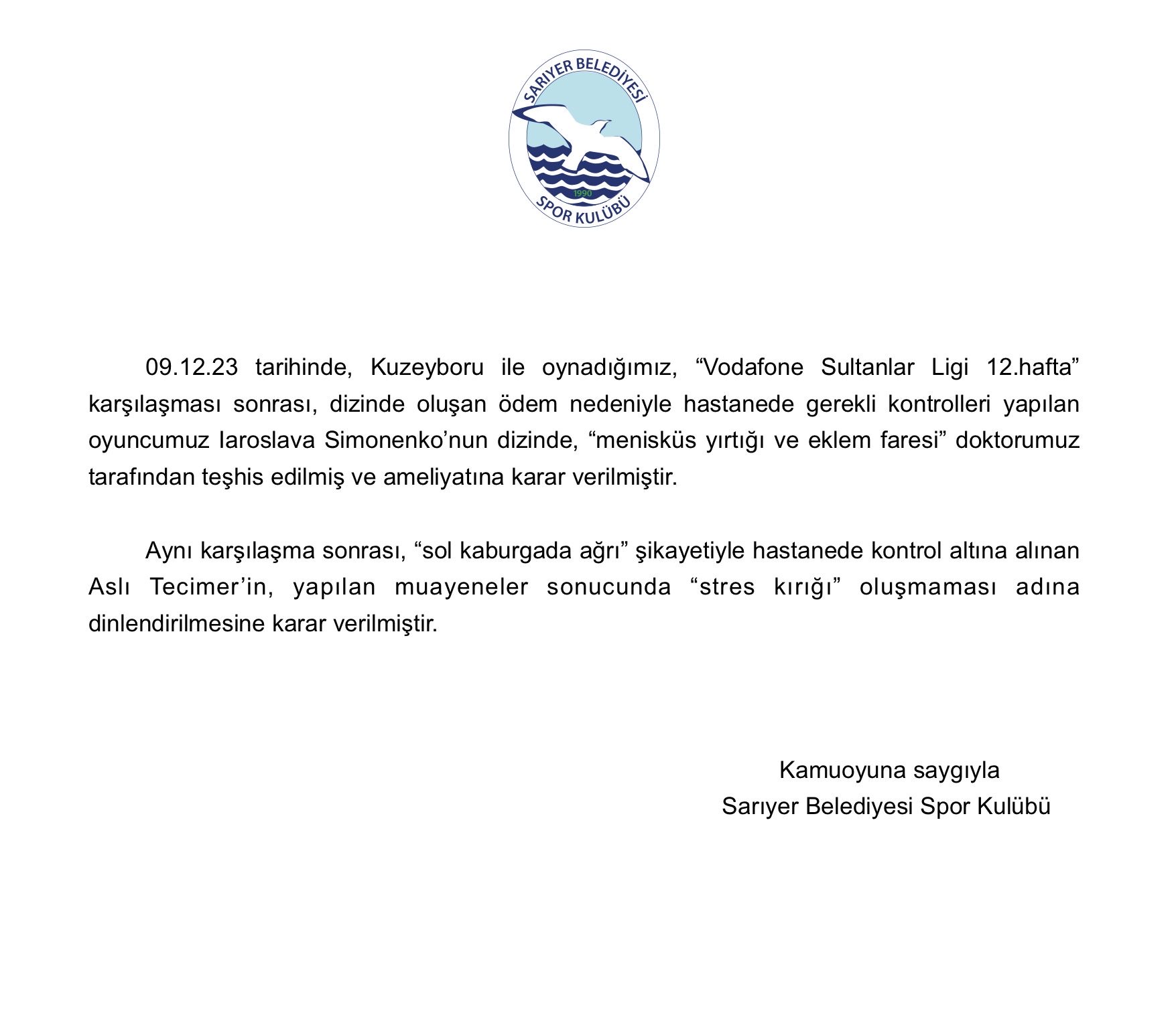 Vodafone Sultanlar Ligi takımlarından Sarıyer Belediyespor, sporcuları Aslı Tecimer ve Yaroslava Simonenko’nun sağlık durumlarıyla ilgili bilgi paylaştı.
